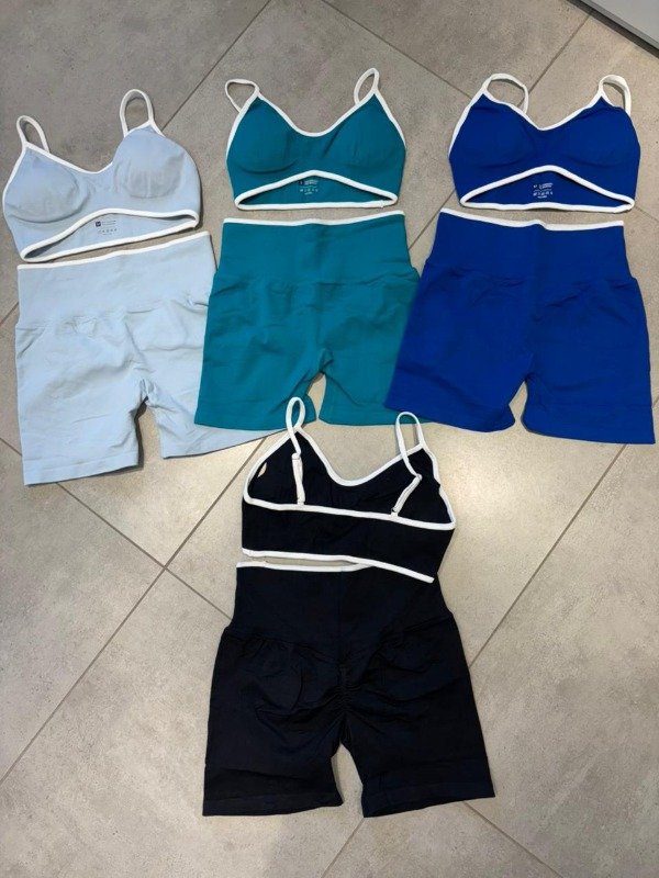 Conjunto de short con frunce (corte corazón) + top con tiras finas y regulables, viene con tasas desmontables. Ambas prendas poseen líneas blancas que rebordean los contornos. Tela 100% premium, agarre y comodidad aseguradas.